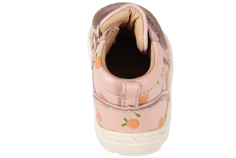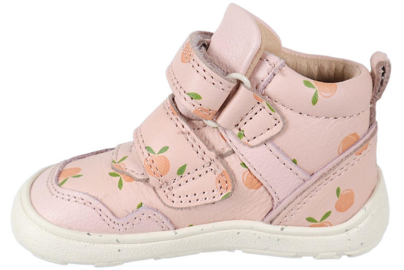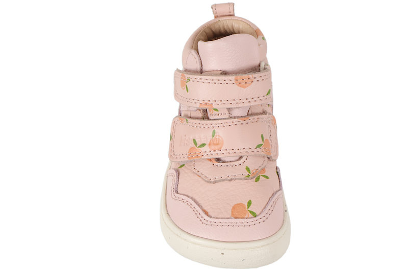 Super god børnesko til piger. Skoen er lavet af skind i en flot lyserødfarve, med små ferskner på. Foran er der to velcroremme, så den er let at tilpasse efter foden, samt komme i og af. Indvendigt er den foret med lyst skind og har en skind indlægssål. Slidsålen er en beige gummisål med forstærkning, som også går op over snuden. Rigtig god begynder sko, som støtter foden godt. Modellen er en barefoot sko, der gør den ekstra rummelig.
