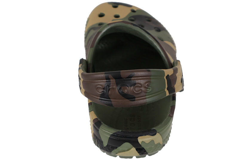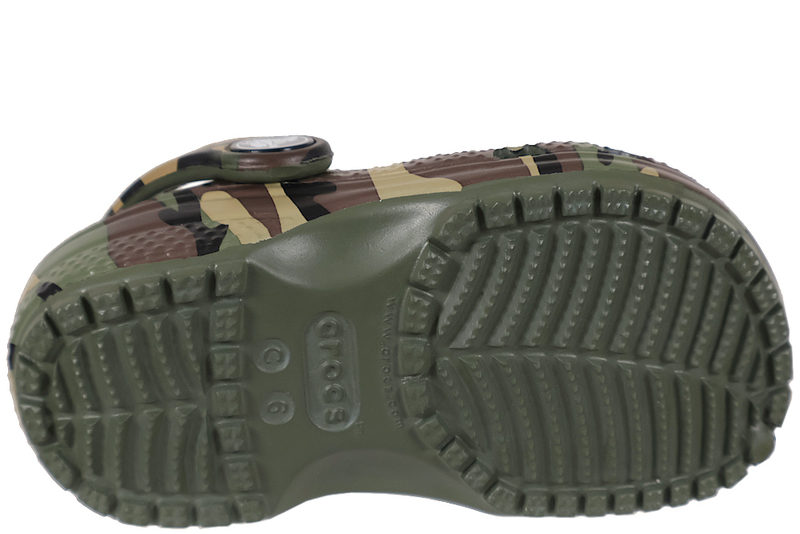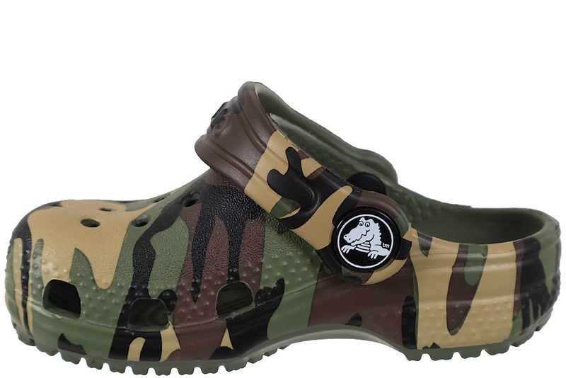 Super smart Crocs til drenge. Den er lavet af army grøn gummi med camoflage. Der er en rem, som kan sidde over vristen, eller sættes bag på hælen, så det sidder bedre fast på foden. De tåler vand.