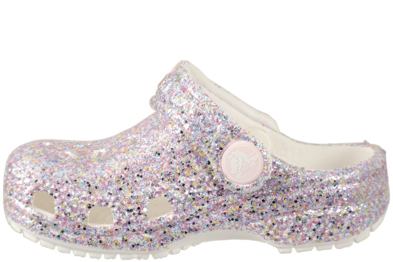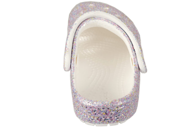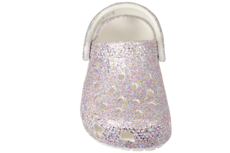 Glitter clogs i gummi fra Crocs. De er super lette og luftige med huller over forfoden. Remmen kan bruges både over vristen og omkring hælen. Skoene er antibakterielle. De er super nemme at komme i og skønne at bruge. Tåler vand.