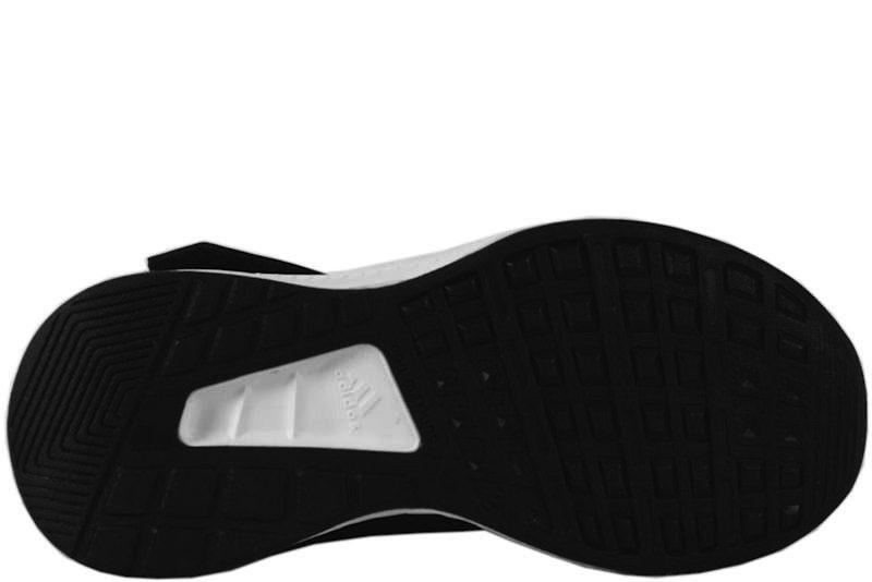 ADIDAS RUNFALCON. Sort sneakers fra Adidas med hvide striber på ydersiden og indersiden. Den har sorte elastik snørebånd over et velcrobånd over vristen. Slidsålen er sort og mellemsålen er hvid. Den kan også bruges som en indendørs sportsko da sålerne er non-marking såler. Indvendig er den foret med sort tekstil.