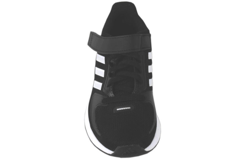 ADIDAS RUNFALCON. Sort sneakers fra Adidas med hvide striber på ydersiden og indersiden. Den har sorte elastik snørebånd over et velcrobånd over vristen. Slidsålen er sort og mellemsålen er hvid. Den kan også bruges som en indendørs sportsko da sålerne er non-marking såler. Indvendig er den foret med sort tekstil.