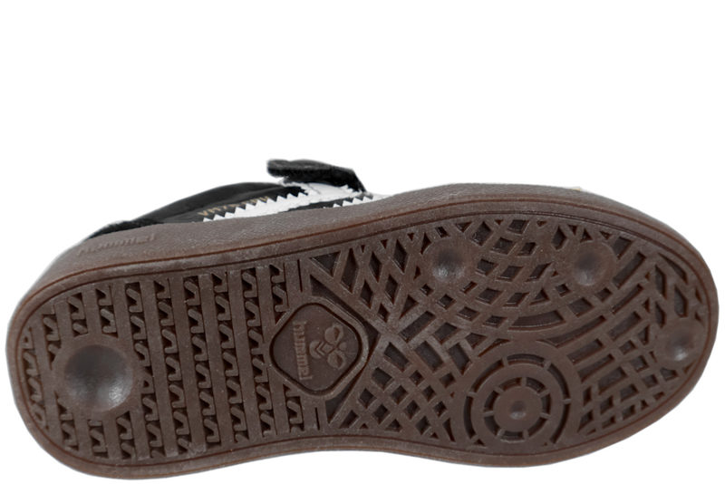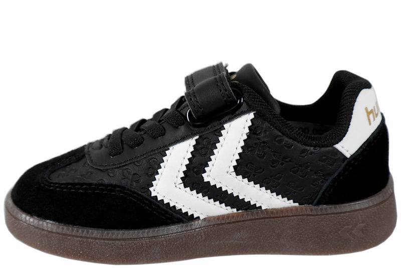 Super smart sko fra Hummel til børn. Skoen er lavet af sort PU og sort ruskind. Op langs vristen er der et sort velcrobånd, som gør skoen let at komme i og få af for barnet. På inder- og ydersiden har skoen de velkendte hummel-pile i hvid. Indvendigt er skoen foret med sort tekstil og den har en sort dæksål i tekstil. Slidsålen er lavet af naturfarvet gummi. Super smart sko til børn.