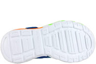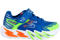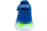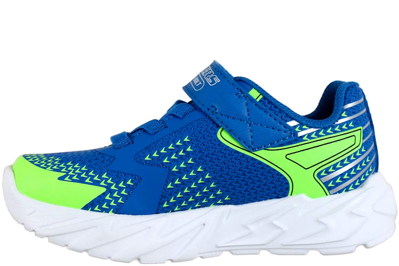 Super smart sko til drenge. Skoen er lavet af blåt, orange og grønt tekstil samt PU. På ydersiden er der et "S" for Skechers. Foran er der blå elastiksnøre, og øverst et velcrobånd med sølv tekst, så den nemt kan strammes godt ind til barnets fod. Indvendigt er den foret med blåt tekstil og har en blød dæksål af grønt tekstil. Mellemsålen er af hvidt EVA skum, hvori der er lys, som blinker når man går. Slidsålen er en hvid EVA sål. Rigtig smart sko til drenge.