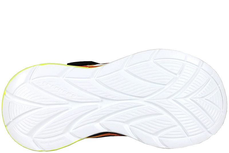 Super smart sko til drenge. Skoen er lavet af sort, rødt og gult tekstil samt PU. På ydersiden er der et "S" for Skechers. Foran er der sorte og grønne elastik snørebånd, og øverst et velcrobånd med gul og rød tekst, så den nemt kan strammes godt ind til barnets fod. Indvendigt er den foret med rødt tekstil og den har en blød dæksål af sort tekstil. Mellemsålen er af hvidt og gult EVA-skum, hvori der er lys, som blinker når man går. Slidsålen er en hvid EVA sål. Rigtig smart sko til drenge.