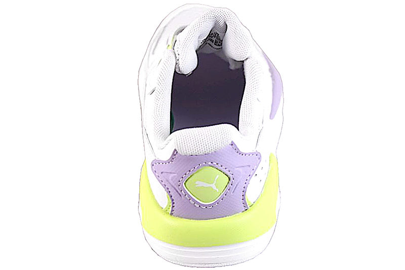 Super smart sneakers fra Puma til piger. Skoen er lavet i hvidt tekstil samt PU, med lilla og grønne detaljer. Op langs vristen har skoen hvide elastik snørebånd, som gør skoen let at komme i og af, men også at den sidder godt ind til foden. På inder- og ydersiden af skoen er der den klassiske Puma bølge. Indvendigt er skoen foret med hvidt tekstil, og har en lille SoftFoam+ indlægssål. Mellemsålen er lavet af hvidt, lilla og grønt EVA, som er blødt at træde på. Slidsålen er lavet af hvidt EVA. Super smart sneakers til pigerne.