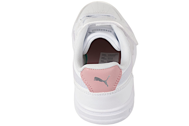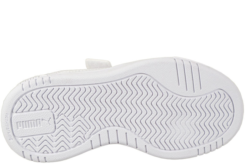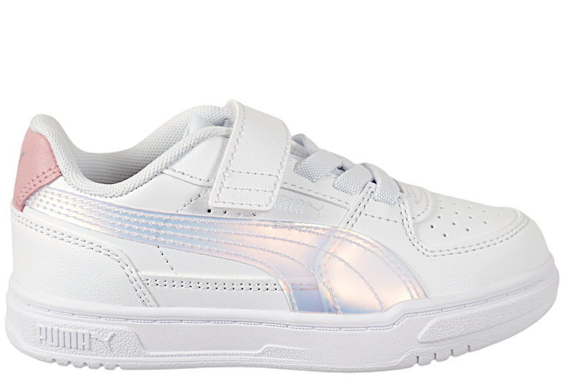 Super smart sko fra Puma til børn. Skoen er lavet af hvidt PU. På inder- og ydersiden af skoen har skoen den velkendte Puma bølge med refleks look i farven perlemor. Bag på hælkappen er der en rosa lap med puma logoet. Langs vristen har skoen hvide elastik snørebånd, så skoen sidder godt ind til foden, samt et velcrobånd ved insteppet, så skoen er let at komme i og af. Indvendigt er skoen foret med hvidt tekstil, og har en lyserød indlægssål. Slisålen er en slidstærk hvid gummisål, så barnet let kan stå fast. Super smart sko til børn.