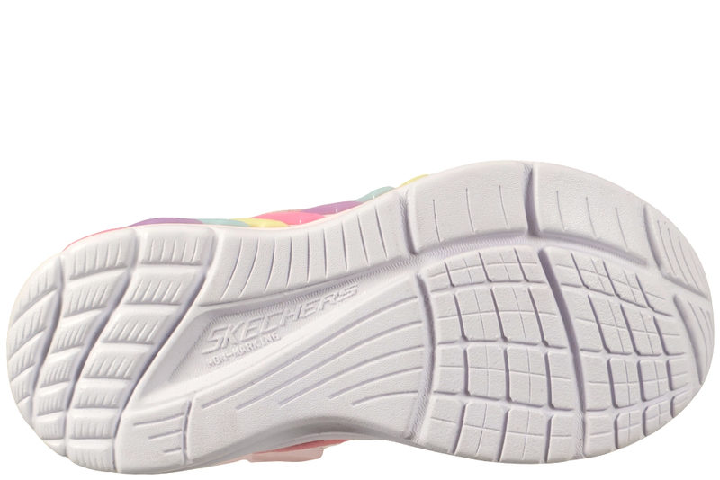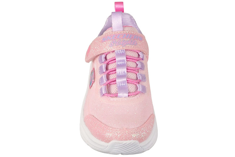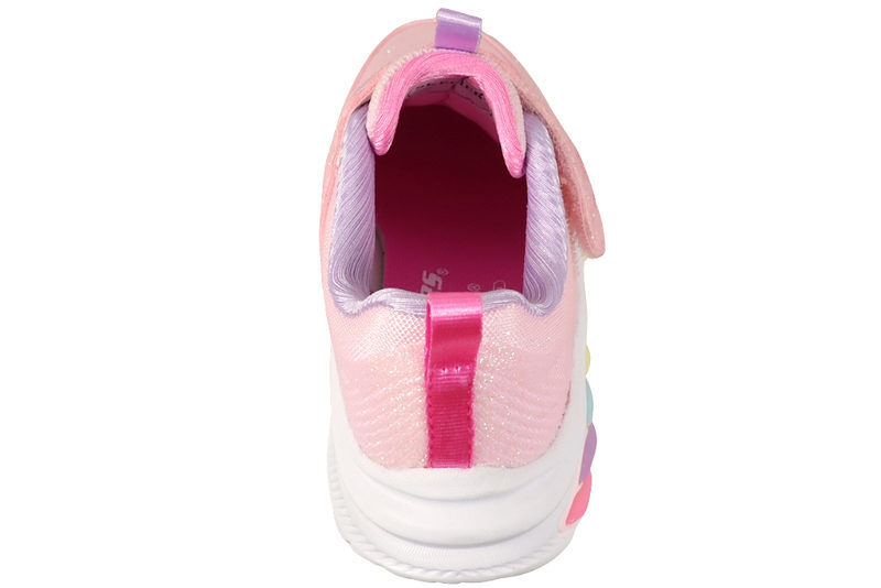 Smart sneakers med lys fra Skechers til piger. Skoen er lavet i lyserød tekstil med glimmer. Den har lyserøde elastiksnøre op langs vristen i samme farver som skoen. Øverst oppe ved insteppet er der en velcrorem i lyserød med glimmer, som gør skoen lettere for barnet at komme i og af. Indvendigt er den foret med lilla tekstil og har en dæksål i pink. Mellem- og slidsålen er lavet af EVA-skum og har integreret lys i regnbuens farver, der lyser når man går. Virkelig smart sko til piger.