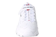 SKECHERS GIRLS ENERGY. Super lækker sneakers fra Skechers. Skoen er i hvid pu med sølv og hvide detaljer. Skoen er med elastiksnøre og velcro over forfoden. På hælen er der et mørkeblå "S" som står for Skechers, samt SKX i mørkeblå og rød. SKX er også mørket i samme farver på ydersiden af skoen. På pløsen er der et mærke med "Skechers Sport", også i hvid, rød og blå. Smart sneakers til pigerne.