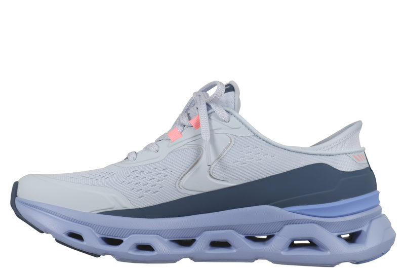 Smart sneakers fra Skechers til dame. Skoen er lavet af tekstil i en flot lyseblå farve, med blå detaljer. Foran er der lyseblå snørebånd, så den nemt kan tilpasses efter foden. Indvendig er den foret i lyseblåt tekstil. Indlægssålen er med det velkendte Air-Cooled Memory Foam. Slidsålen er lavet af violet EVA og har luftbobler, der gør den mere stødabsoberende. Modellen er med SLIP-INS.