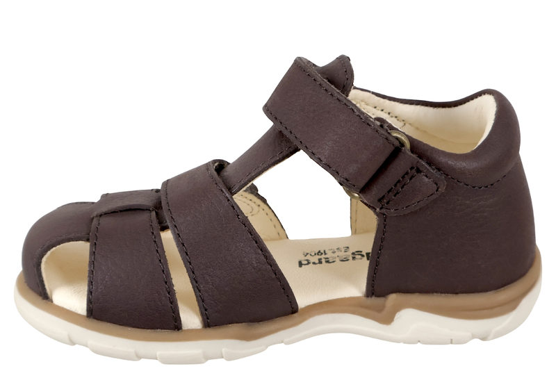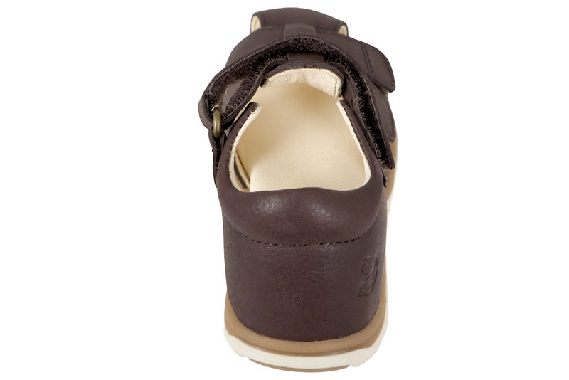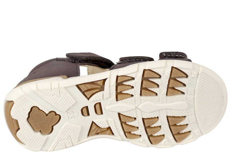 Børnesandal fra Bundgaard med lukket tå og med velcrobånd over foden samt over vristen. Den er i lækker kvalitet med skindfoer og slidsålen er en hvid blød gummisål. Den er lukket i hælkappen, hvilket giver den optimale støtte. Der står "bundgaard" bagpå hælkappen og der en lille kanin på siden. Super lækker børnesandal fra Bundgaard.