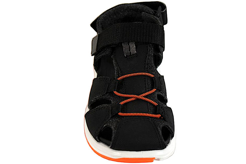 Sort sandal med lukket tå til drenge. Sandalen er med 2 velcroremme, en over vristen og en rundt om hælen. Hen over forfoden har den orange elastiksnøre, der giver skoen en smart detalje. Slidsålen er orange og hvid gummi, som er meget slidstærk og meget lækker komfort. Sandalen tåler vand.