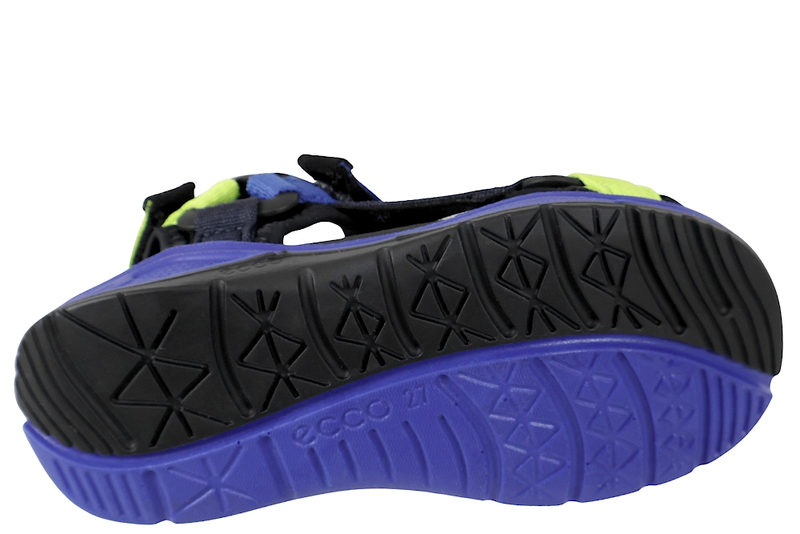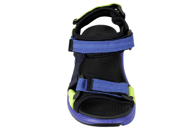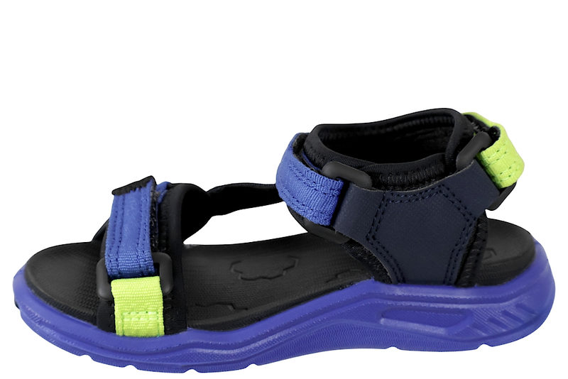Super fin sandal fra Ecco til drenge. Sandalen er lavet af blåt og gult tekstil. Den er foret med sort tekstil, og er med tre justerbare velcroremme, en om hælen, over forfoden og en over tærerne. Dæksålen er lavet af sort PVC. Mellemsålen er i blåt EVA, og slidsålen er i sort gummi. En super fin sandal til drenge.