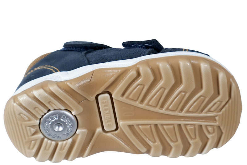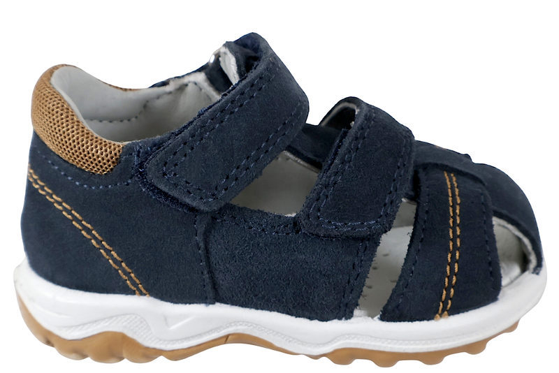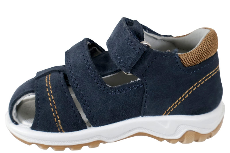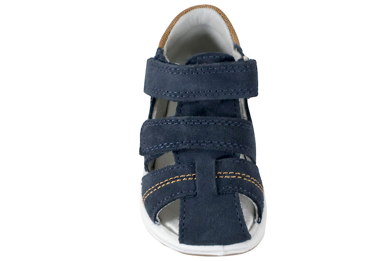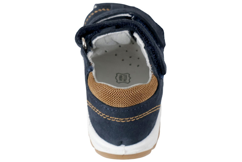 Super fin sandal fra Imac til børn. Sandalen er lavet af blå ruskind. Ved insteppet og henover vristen har sandalen en velcrorem, som gør det let at komme i og af sandalen. Indvendigt er sandalen foret med gråt glat skind, og har en skind dæksål. Slidsålen er lavet af brunt gummi. Sandalen er med fast hælkappe samt stødabsobering. Super fin sandal til små børn.