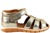 Super god sandal fra Bisgaard til piger. Sandalen er med lukket snude. Oppe omkring anklen er der en velcrorem, så den kan tilpasses efter foden. Sandalen er lavet af skind i en flot platin farve. Indvendigt er den foret med lyst skind og har en dæksål ligeledes i skind. Slidsålen er lavet af lysebrunt gummi, så man står godt fast.