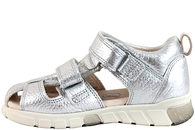 Super sød sandal til piger. Sandalen er lavet i sølvfarvet glat skind, med metallic effekt. Modellen er med lukket snude og fast hælkappe, så de sidder godt på foden. Der er en velcrorem over foden og en over vristen. På den måde er den let at tilpasse til foden og samtidig let at komme i og af. Indvendigt er den foret med lyst skind og har en dæksål i skind. Slidsålen er lavet i råhvidt gummi med glimmer detaljer i PU. Sandalerne er desuden super fleksible og bløde.