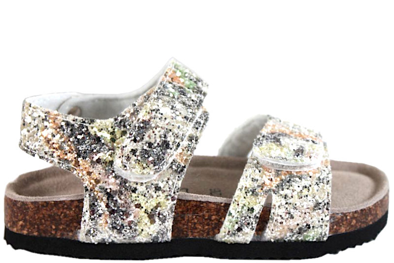Smart sandal med bagrem og glitter til piger. Sandalen er lavet i tekstil med glimmer i sølv, grønne og orange nuancer. Der er en justerbar velcrorem over forfoden og over vristen. Dæksålen er grå og lavet i blødt tekstil. Mellemsålen er i kork. Slidsålen er i sort EVA. Super sød sandal til pigerne.