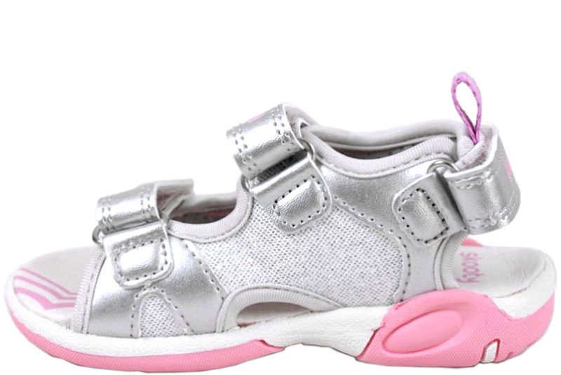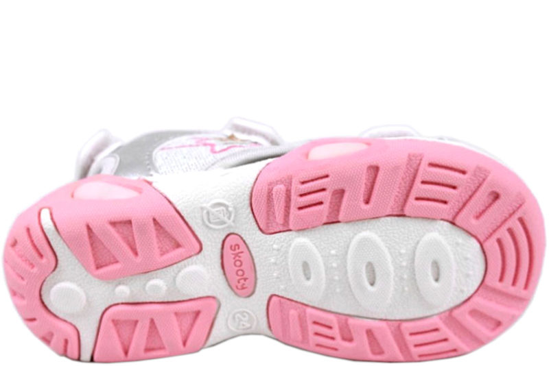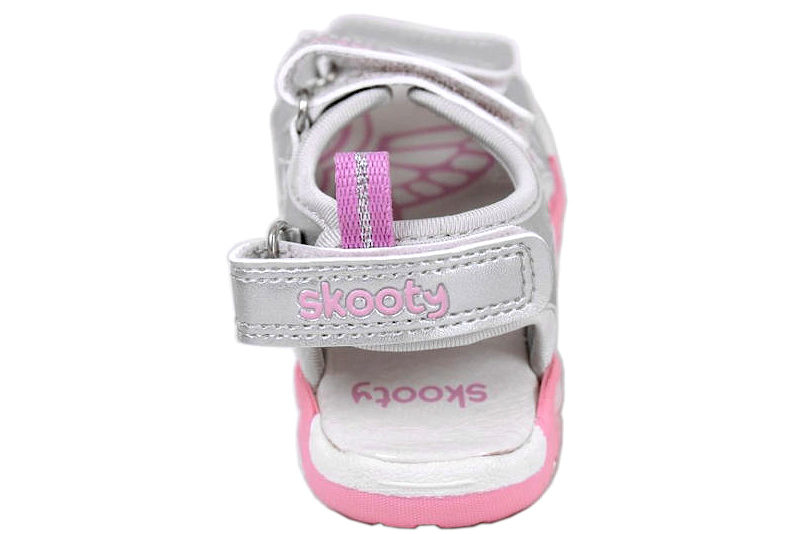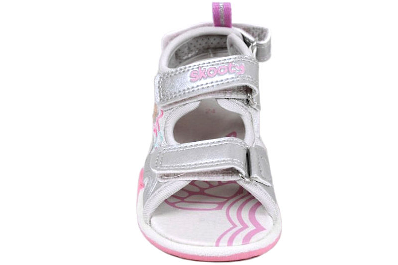 Rigtig smart sandal fra Skooty. Sandalen er lavet i sølvfarvet PU. Skoen er med tre velcroremme, to over foden og en på hælen, så den kan spændes godt ind til foden. På ydersiden er der en stjerne og et hjerte. Sandalen er med en lyserød og hvid mellemsål med lys der blinker, når man går. Sandalen er med en grå og lyserød slidsål. Indvendigt er skoen foret med grå tekstil. Sandalen har en lyserød dæksål, der er rigtig blød at gå på.