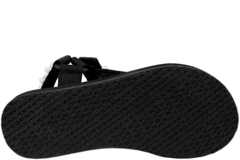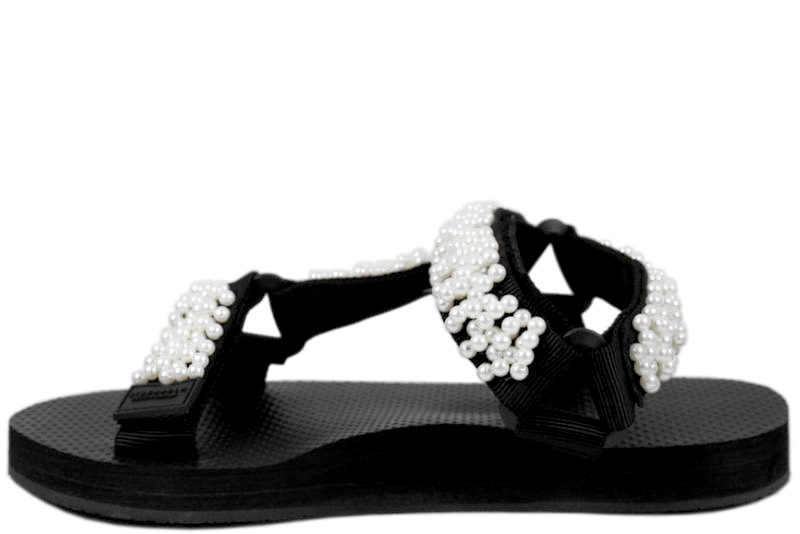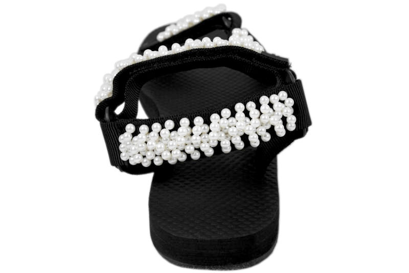 Super fin sandal fra Stockholm Design. Sandalen har to justerbare remme, over forfoden, samt en rem bagom hælen, som ikke kan justeres. På remmene er der små hvide perler, som ser så sødt ud. Mellemsålen er en sort EVA sål og slidsålen er en sort gummisål. Super fin sandal til piger.
