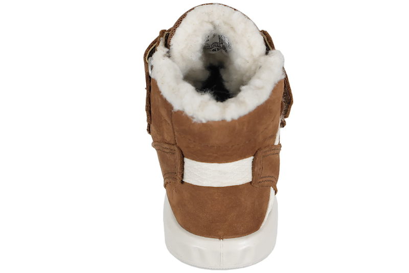 Super sød vinterstøvle til børn. Støvlen er lavet i brunt olieret nubuck. Over vristen er der to velcroremme, som gør den let at komme i og få af samt regulere støvlen efter barnets fod. Indvendigt er støvlen foret med hvidt uld, så den er dejlig varm til de kolde måneder. Støvlen har en sort indlægssål i uld. Slidsålen er lavet af hvidt PVS. Støvlen er med Gore-Tex, der gør den vandtæt. Super god og fin støvle til børn.