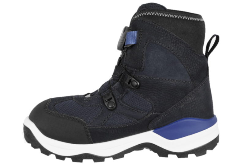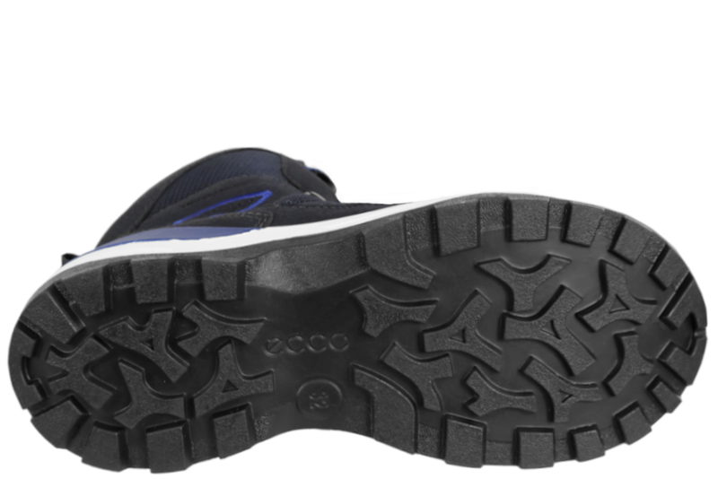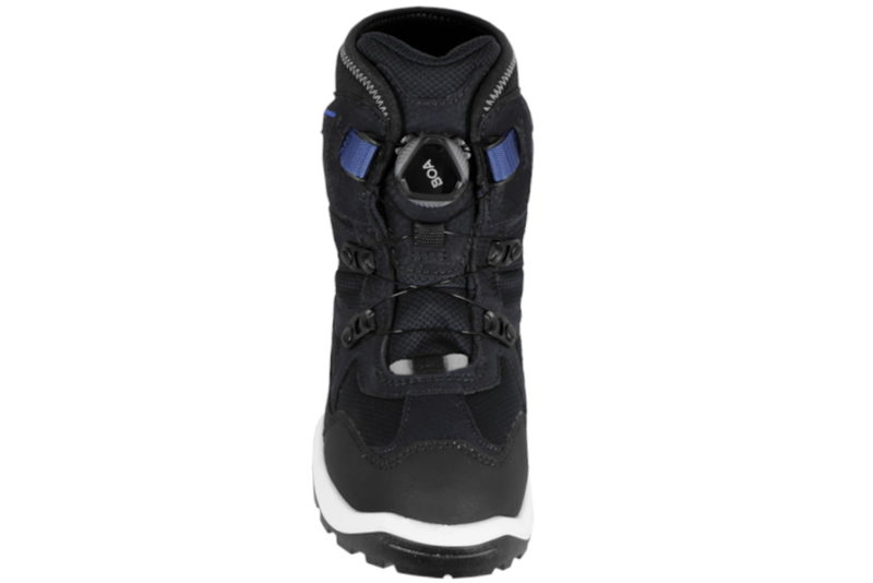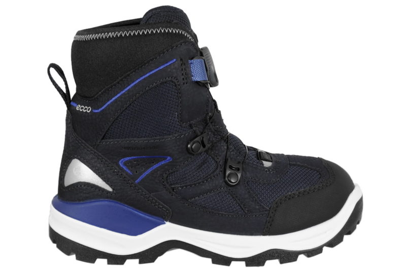 Super god vinterstøvle fra Ecco. Støvlen er lavet af sort og blå tekstil og skind. Op langs vristen og op ad skaftet er der en BOA-lukning, som gør det let for barnet at komme i og af støvlen. Indvendigt er støvlen foret med sort foer, som gør støvlen varm på de kolde vinterdage. Støvlen er med "GORE-TEX", som gør at støvlen er vandtæt. Støvlen har en let foret indlægssål. Mellemsålen er lavet af hvidt PU. Slidsålen er lavet af sort gummi, så man let kan stå fast. Super fin og praktisk vinterstøvle til børn.