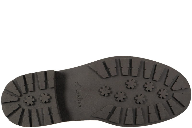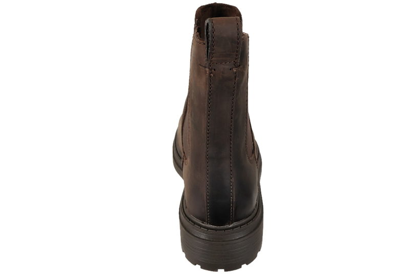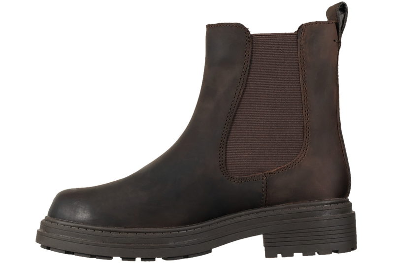 Flot ankelstøvle fra Clarks til damer. Støvlen er lavet af brunt olieret skind. I begge sider af støvlen er der brun elastik, så den slutter sig flot ind til benet. Indvendigt er den foret med brunt tekstil, og den har en skind dæksål. Slidsålen er en brun gummisål, så man står fast.