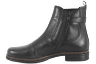 Smart støvle fra Gabor. Støvlen er lavet af sort glat skind. På ydresiden er der sort elastik. Skoen har et spænde med en læderrem bagved hælen, der giver støvlen et flot look. På indersiden er der en lynlås, så den er let at komme i og af. Indvendigt er støvlen foret med sort tekstil og har en Best Fitting indlægssål, som er blød at træde på. Slidsålen er en sort gummisål. Super flot støvle, der kan bruges til meget.