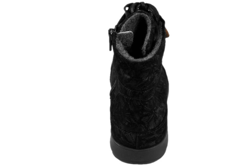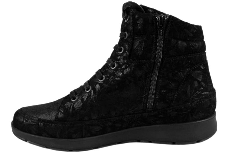 Støvle fra New Feet i sort kalveskind med blomster mønster shine. Foran er der snørebånd i sort samt lynlås på indersiden i sort. Indvendigt er der blødt foer i grå farve, så man kan holde varmen. Støvlen har Tex, hvilket vil sige den er vandtæt. Støvlen har OnSteam®, som er New Feets foretrukne materiale til foer. Det kaldes også teknisk læder, da det opleves meget som læder. Det er dog et mikrofiber-materiale, som tillader en 6 gange så stor fugtighedstransport som læder, så det absorberer fugt lynhurtigt. Slidsålen er en sort gummiså som er let, så støvlen er utrolig behaglig at have på.