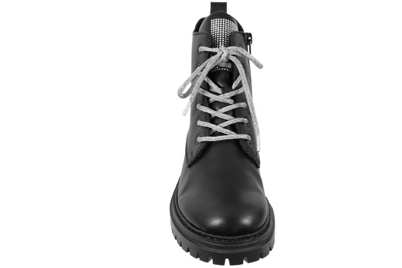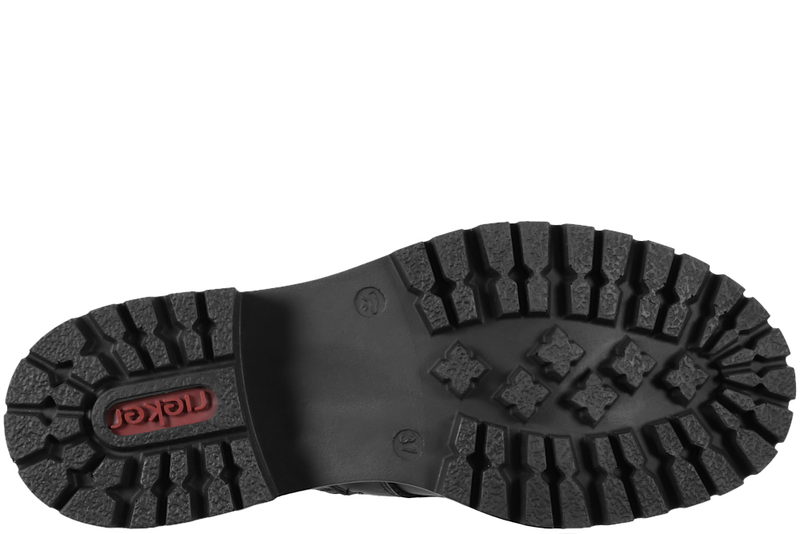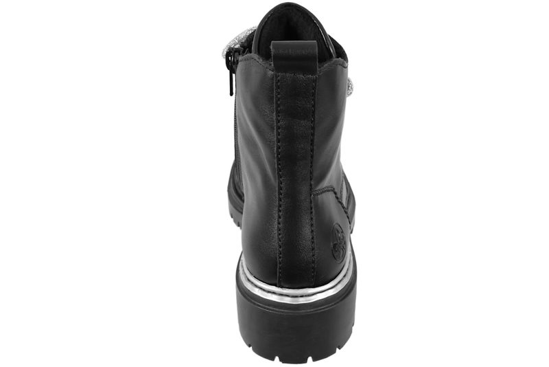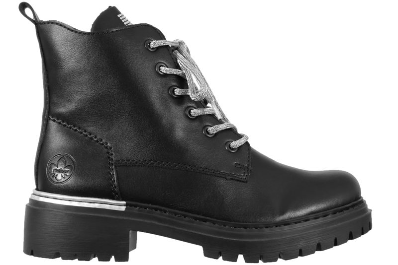 Smart ankelstøvle fra Rieker til damer. Støvlen er lavet af sort PU. Foran er der sølv snørebånd. På indersiden er der en lynlås, så den er let at komme i og få af. På pløsen er der sølvsten, som giver et smart look. Indvendigt er den let foret med sort plysfor. Slidsålen er en grov sort gummisål