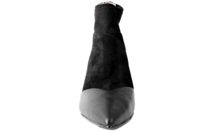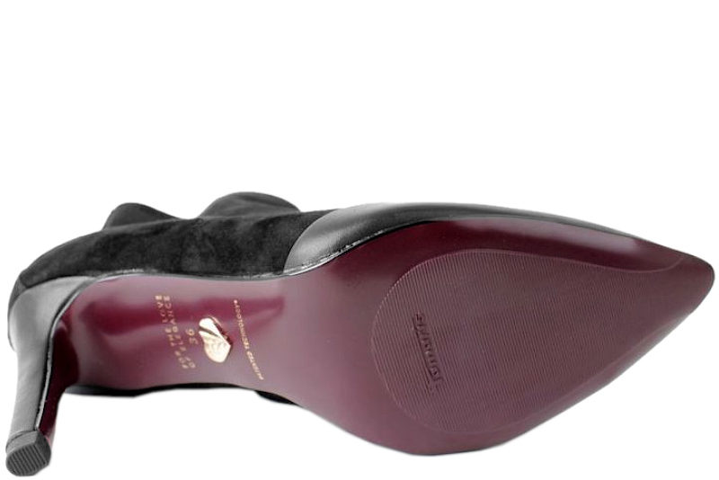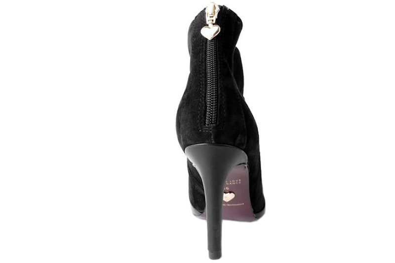 Sort støvle fra Tamaris med lynlås i hælkappen. Hælen måler 8,5 cm. Støvlen har sort skind på snuden, sort ruskind midt på støvlen og den øverste del af skaftet er blød alcantara. Indvendig træder man på en utrolig lækker indlægssål som er formet, så den støtter svangen. Slidsålen er bordeaux farvet og den har et guld hjerte under sålen samt på lynlåsen. Flot og rap støvle fra Tamaris.