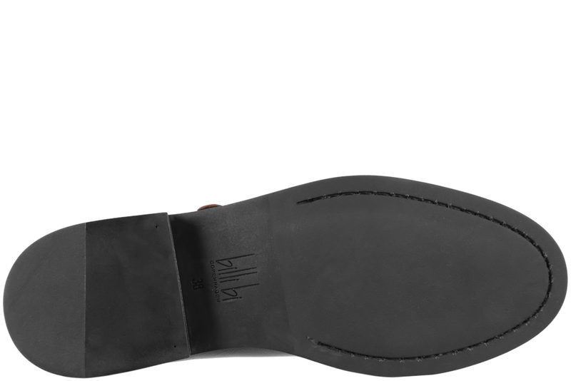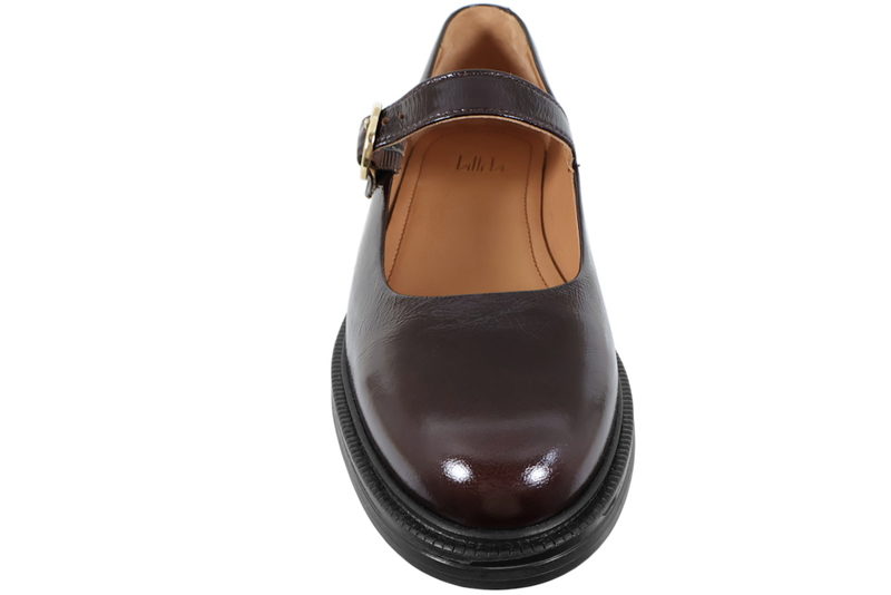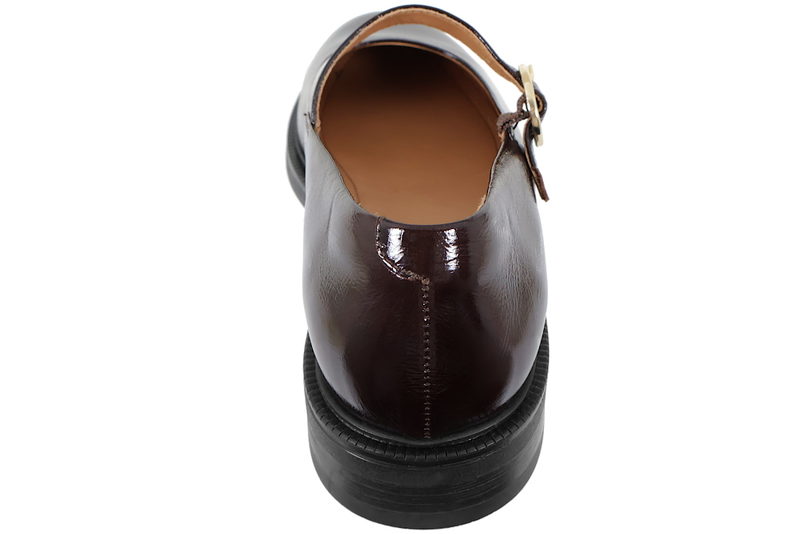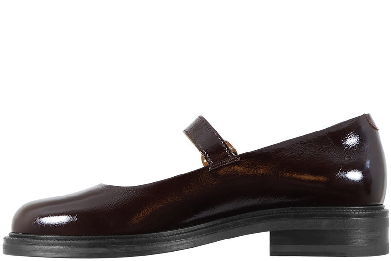 Bordeaux ballerina med rem over vristen. Skoene er lavet i polido og foret med ægte skind. Remmen der går over vristen lukkes med et lille guldfarvet spænde. Slidsålen er en sort gummisål og skoen har en lille hæl. Super fin sko, som har et meget klassisk og feminint look.