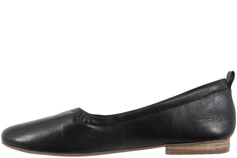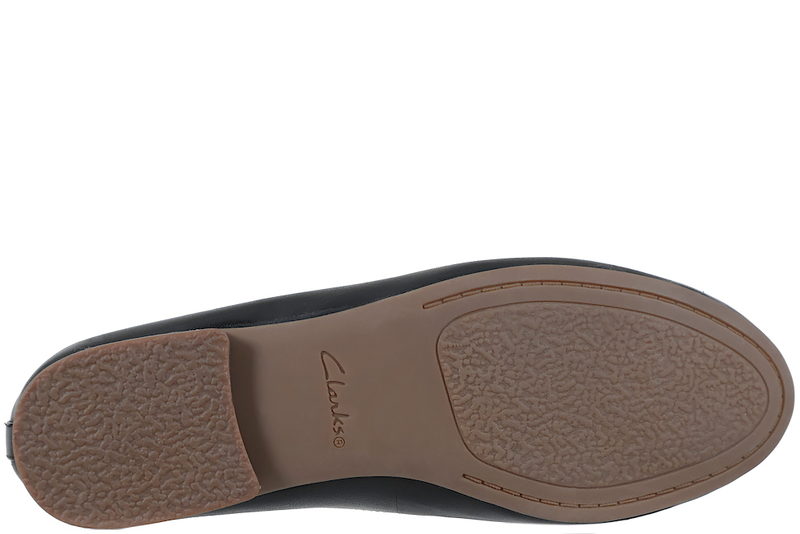 Super fin ballerina fra Clarks. Skoen er lavet i sort glat skind. Den er med spids snude, som giver en fin detalje. Indvendigt er skoen foret med sort skind, og den har en sort dæksål i skind. Slidsålen er lavet af brunt gummi. Super fin ballerina til damer.