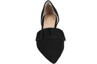 Super smart ballerina fra Copenhagen Shoes. Skoen er lavet af sort ruskind. Foran er der en lille flæse, som giver et super flot look. På inder- og ydersiden er den åben, hvilket gør den rigtig elegant. Den er med en lille hæl. Indvendigt er den foret med sort skind. Rigtig flot ballerina, der kan bruges til mange outfits.