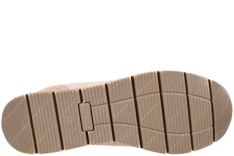 Super fin og let ballerina fra Imac. Skoen er lavet i lyserødt tekstil med glimmer. På hælkappen er der lyserødt platin skind. Indvendigt træder man på en beige skindsål. Mellemsålen er lavet i hvidt EVA-skum. Slidsålen er en naturfarvet let gummisål. Praktisk og let ballerina til damer.