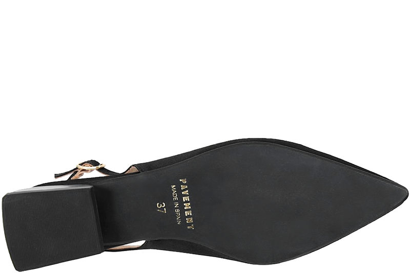 Flot og elegant slingback med spændelukning fra Pavement til damer. Skoen har en spids snude og er lavet af sort tekstil. Indvendigt er den foret med brunt skind og har en dæksål ligeledes i skind. Slidsålen er lavet af PVC og har en hælhøjde på 1,5 cm.