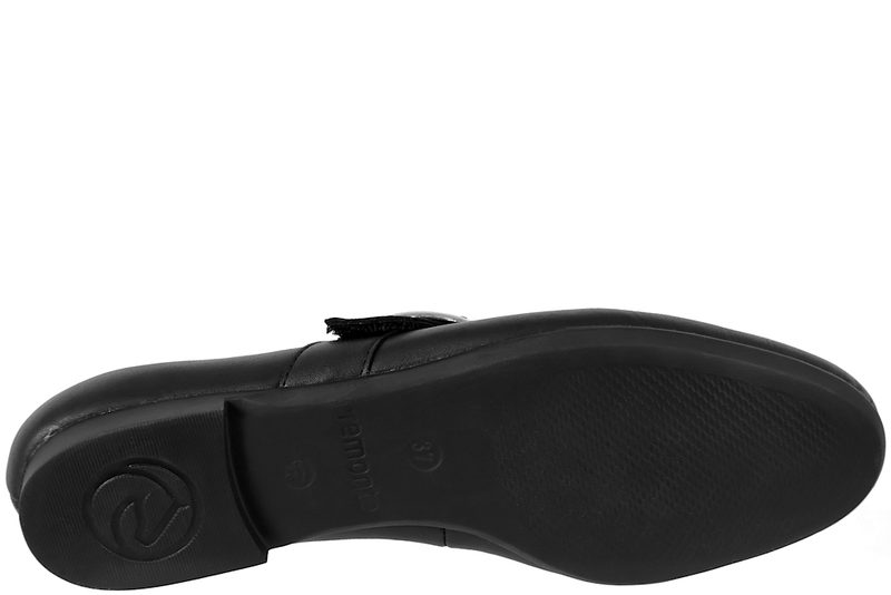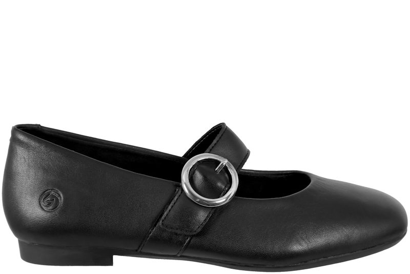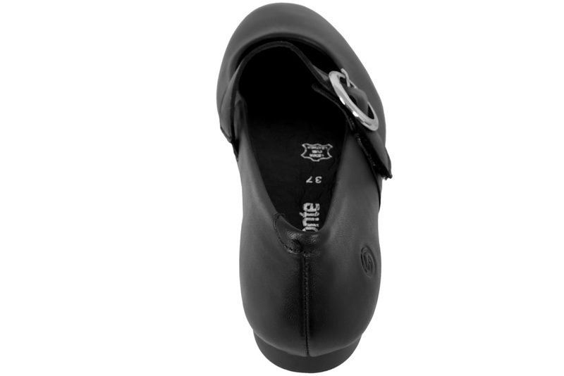 Super sød ballerina fra Remonte til dame. Skoen er lavet af sort glatskind. Over vristen er der en sort rem med spænde og velcro. Indvendigt er skoen foret med sort tekstil. Skoens dæksål er lavet af sort glatskind. Slidsålen er lavet af sort gummi. En super sød ballerina til dame.