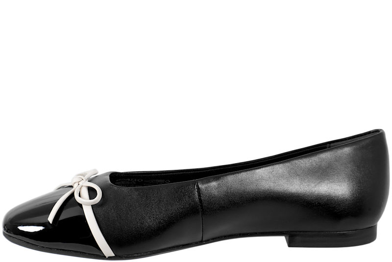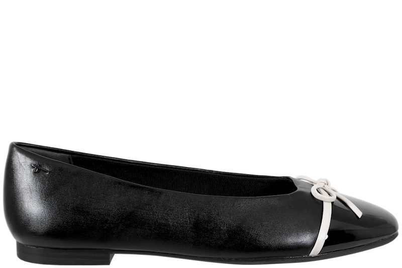 Smart ballerina fra Tamaris til dame. Den er lavet af sort glat skind og har en fin cremefarvet sløjte ude på den firkantede snude betrukket i lak. Indvendig er den foret med tekstil og har en Touch IT dæksål i skind. Slidsålen er lavet af sort PVC. En lækker ballerina, der kan bruges til meget.