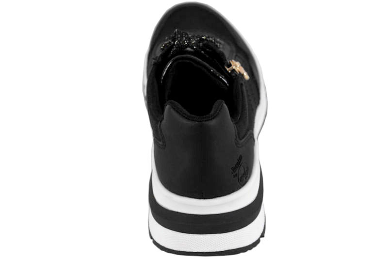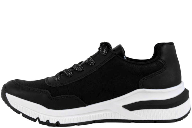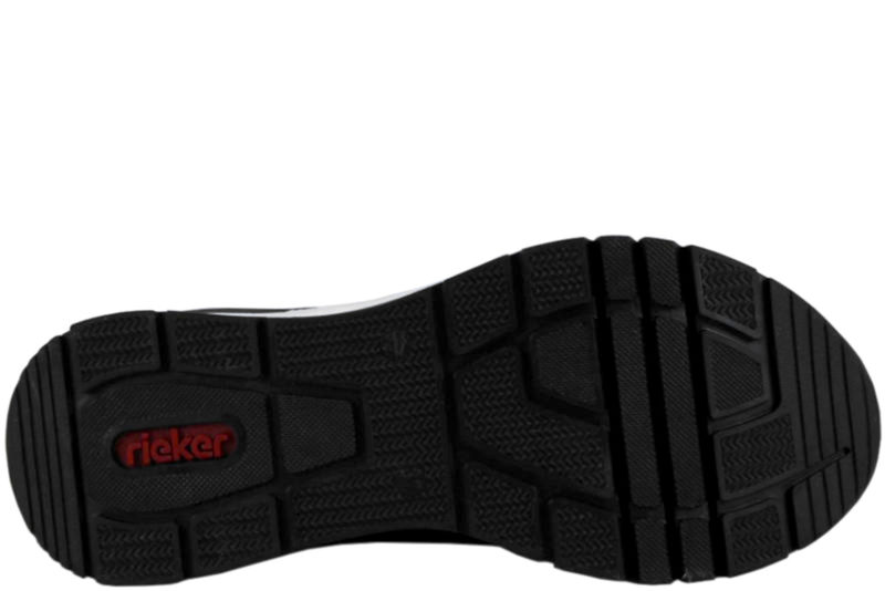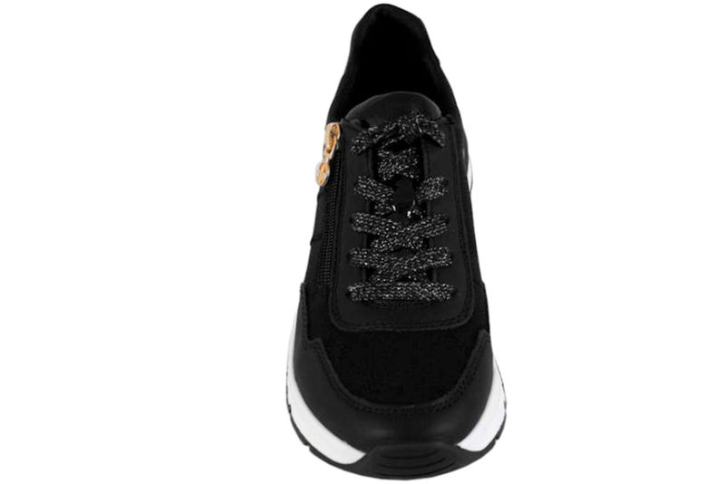 Smart sko fra Rieker til damer. Skoen er lavet i sort PU. Skoen har sorte snørebånd med guldnister samt en guld lynlås med vedhæng på ydersiden, så den er nem at komme i og af. Indvendigt er der en MemoSoft sål, som gør skoen behagelig at have på. Slidsålen er hvid med sorte detaljer, som giver skoen et smart, lidt sporty look. Fin sko til alle anledninger.