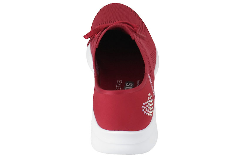 Super let, god og flot fritidssko fra Skechers til damer. Skoen er lavet af rød tekstil med stretch og har en fast hælkappe. Over vristen har skoen pynte snørebånd i rød med glimmer. Skoen er foret indvendigt med rød tekstil og har en Air-Cooled Memory Foam indlægssål. Slidsålen er lavet af hvidt EVA skum. På hælkappen har skoen et hjerte af rhinsten. Denne model er vegansk. Meget lækker sko fra Skechers, som er let at komme i og af. Dette er den populære slip-ins model, som man kan komme i uden brug af skohorn eller hænder. Super smart, praktisk og let sko.