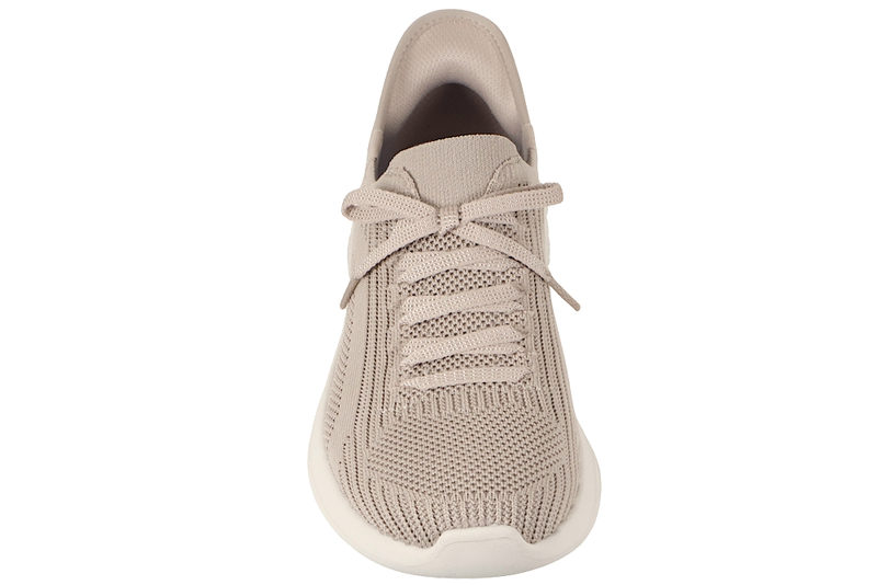 Super let, god og flot fritidssko fra Skechers til damer. Skoen er lavet af beige tekstil med stretch og har en fast hælkappe. Over vristen har skoen pynte snørebånd i beige. Skoen er foret indvendigt med beige tekstil og har en Air-Cooled Memory Foam indlægssål. Slidsålen er lavet af hvidt EVA skum. Denne model er vegansk. Meget lækker sko fra Skechers, som er let at komme i og af. Dette er den populære slip-ins model, som man kan komme i uden brug af skohorn eller hænder. Super smart, praktisk og let sko. Skoen kan vaskes.