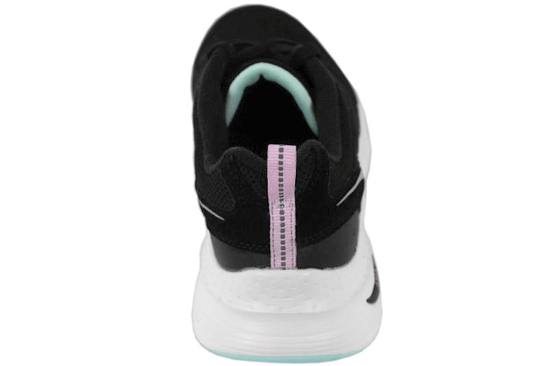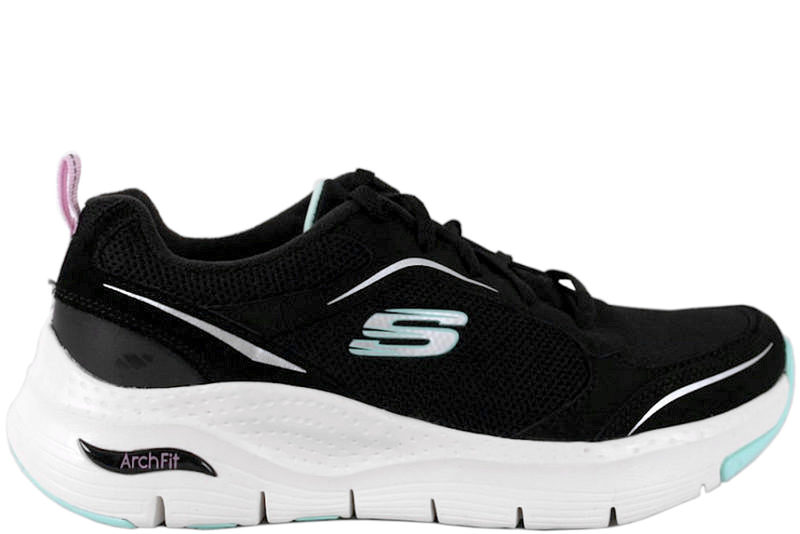 Smart sko fra Skechers i sort mesh. På ydersiden er der et "S" som står for Skechers. Skoene er med matchende sorte snørebånd, så de let kan tilpasses til foden. Indvendigt er skoen foret med sort tekstil. Skoene har Arch Fit såler, som er lavet til folk som går meget og dyrker sport. Den høje sål gør den super dejlig at gå med, og højden gør den samtidig mere stødabsorberende. Slidsålerne er lavet i hvidt EVA skum, samt mintgrønt gummi, så man står godt fast. Rigtig god og behagelig sko. Denne model er med svangstøtte.
