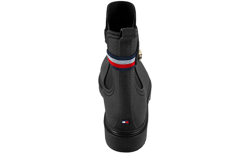 Super smart gummistøvle fra Tommy Hilfiger til dame. Oppe ved insteppet ses det kendte Hilfiger logo i en guldknap, samt en stof strop i blå, hvid og rød bagpå. Indvendigt har den en sort indlægssål. Alt i alt en mega smart gummistøvle.