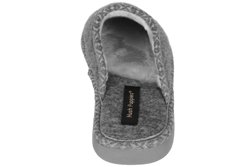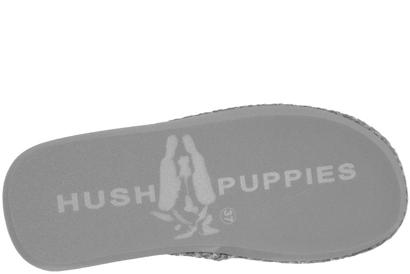 Super fin hjemmesko fra Hush Puppies til dame. Hjemmeskoen er lavet af grå filt. Foran står der "Hush Puppies" med grå tråd. Indvendigt er den foret med grå plys og filt. Slidsålen er en blød og let grå EVA sål. Rigtig let hjemmesko, der er lige til at smutte i.