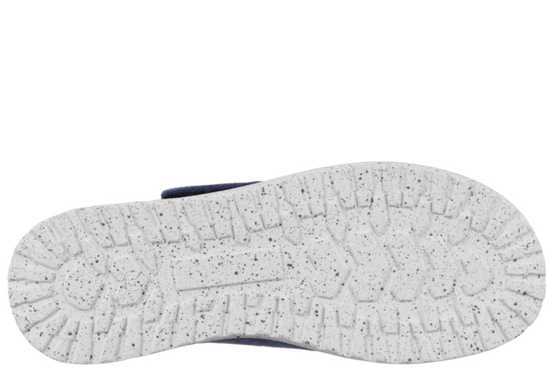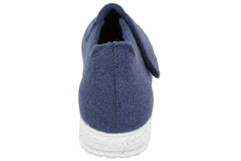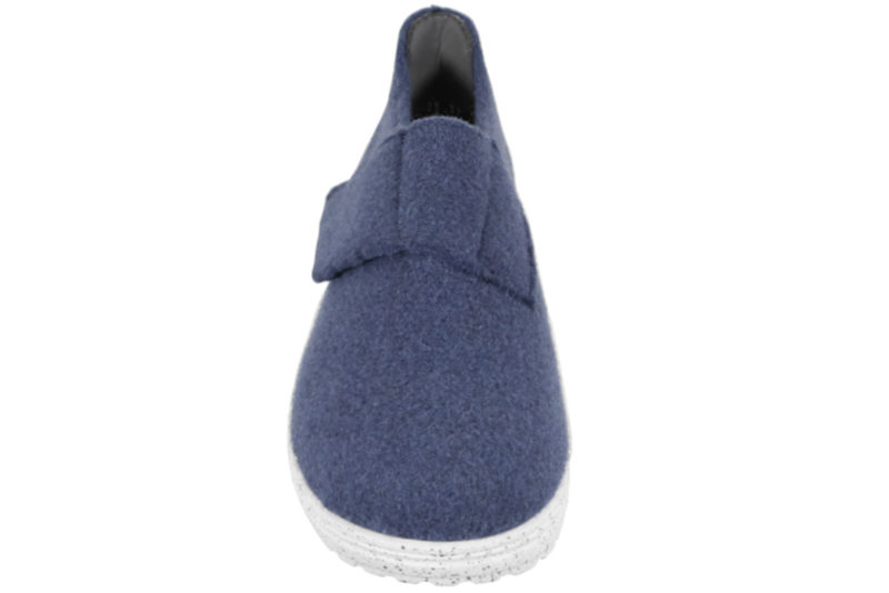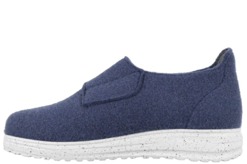 Blå fodformet hjemmesko i uldfilt med en bred blå velcrorem over foden, så de er nemme at komme i og af. Indvendigt er der en 6 mm. støddæmpende sål. Sålen er en lysegrå PVC sål med sorte nister. Hjemmeskoen er anbefalet til gigt og diabetes fødder.