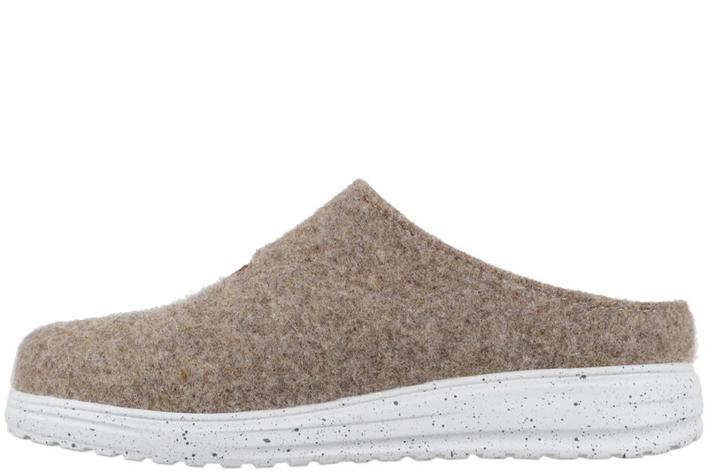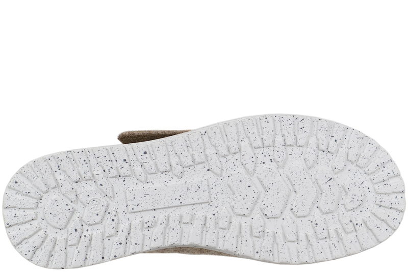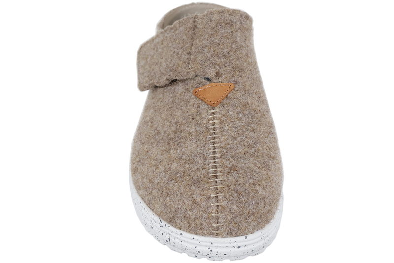 Dame hjemmesko i brun med velcrostrop til regulering af pasformen. Overdelen er lavet i slidstærk filtet uld. Ydersålen er lavet i PU med let gængefunktion. Inde i hjemmeskoen er der placeret en udtagelig 6 mm stødabsorberende Protektor® indlægssål, som beskytter og aflaster foden.