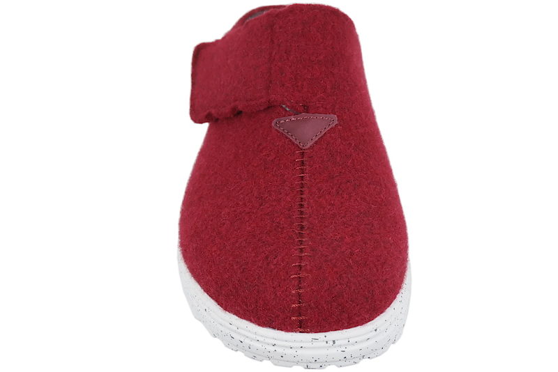 Mørkerød hjemmesko fra New Feet til dame. Hjemmeskoen har en velcrostrop til regulering af pasformen. Overdelen er lavet i slidstærkt filtet uld. Ydersålen er lavet i PU med let gængefunktion. Inde i hjemmeskoen er der placeret en udtagelig 6 mm. stødabsorberende Protektor® indlægssål, som beskytter og aflaster foden. Hjemmeskoen er velegnet til gigt og diabiteker, uden indvendige sygninger.