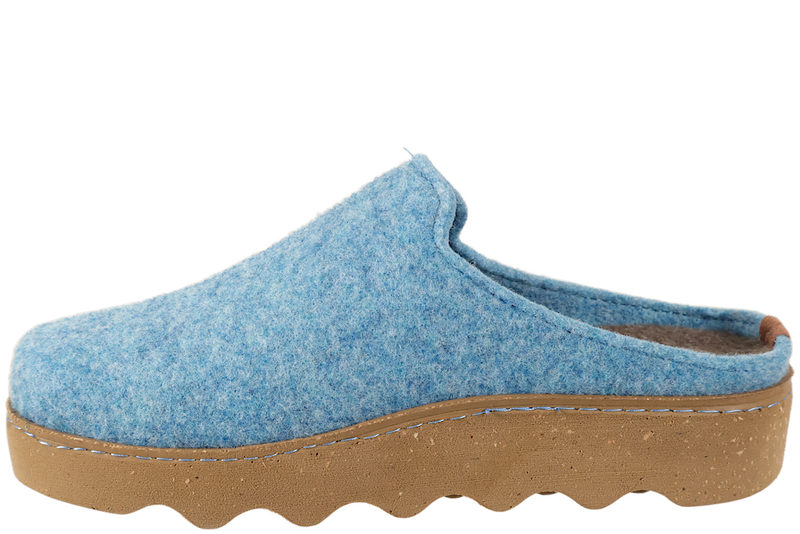 Super fin hjemmesko fra Rohde til dame. Hjemmeskoen er lavet i blå filt. Indvendigt er den foret med blå filt og har en brun indlægssål ligeledes i filt. Foran er der en skindlap, hvor der står "R" for Rohde. Slidsålen er en brun PVC sål, som man går fantastisk på. Skøn og lun hjemmesko fra Rohde.
