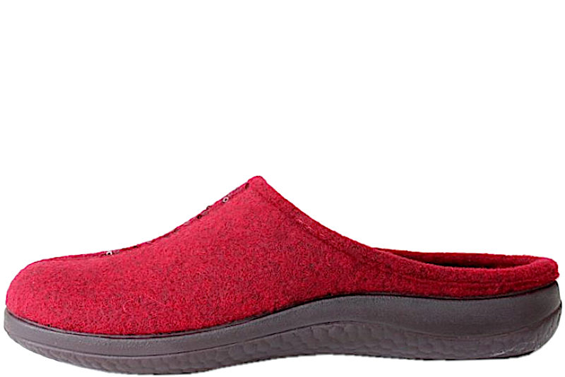 Mørkerød hjemmesko fra Rohde. Hjemmeskoen er af filt og på ydersiden er den med glimtende palietter. Indvendig er der er også filt i mørkerød. Indlægssålen er udtagelig og den er utrolig blød og lækker at træde på. Slidsålen er en brun gummisål. Let og praktisk hjemmesko, som har et frisk look.