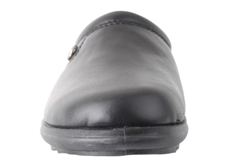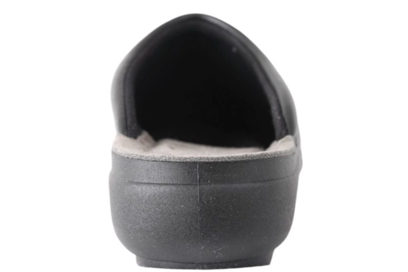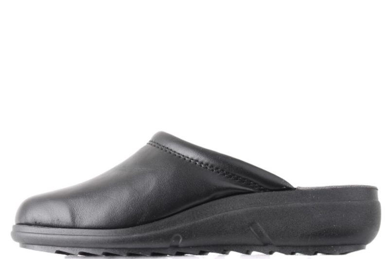ROHDE HJEMMESKO SORT. Sort skind hjemmesko fra Rohde til damer. Hjemmeskoene er sorte og har en lille metalknap på ydersiden af skoen. Den er åben i hælen og nem og lige til at smutte i. Slidsålen er en sort blød gummisål og indvendig træder man på en ruskindsål, som er meget komfortabel idet den er polstret med skum. Meget praktisk hjemmesko i skind til damer med en skøn pasform.