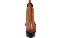 Super smart støvle fra Copenhagen Shoes til damer. Støvlen er lavet af cognacfarvet skind med flettet look. Der er elastik på yder- og indersiden, så den er nem at komme i og af. Hælen måler 3 cm. Invendigt er den let foret med brunt skind og tekstil. Slidsålen er lavet af brunt gummi, så man står godt fast.