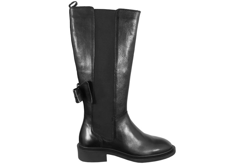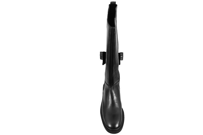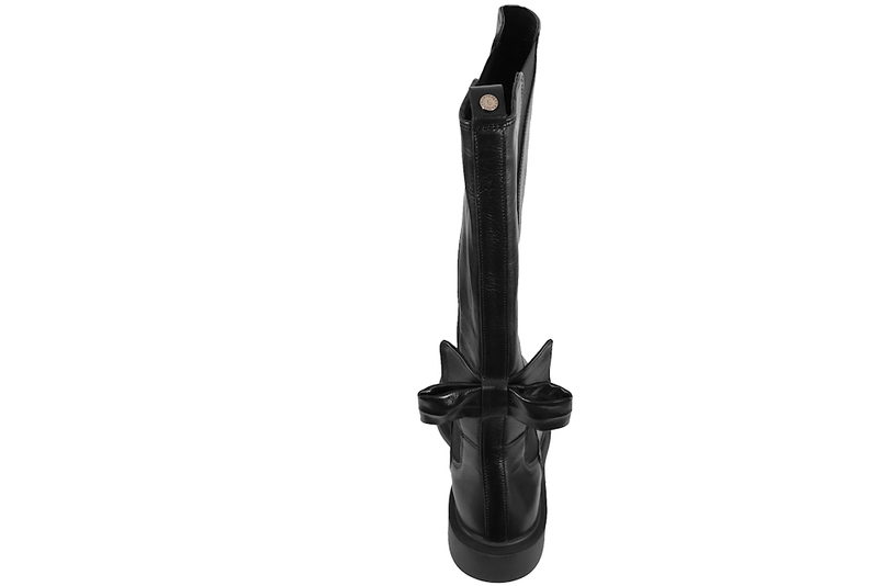 Smart lang støvle fra Copenhagen Shoes til damer. Støvlen er lavet af sort glat skind. I begge sider af støvlen er der sort elastik, som gør den slutter sig flot ind til benet. Bagpå er der en sort sløjfe, som giver et smart look. Indvendigt er den foret med sort tekstil og har en skind dæksål. Slidsålen er lavet af sort gummi.